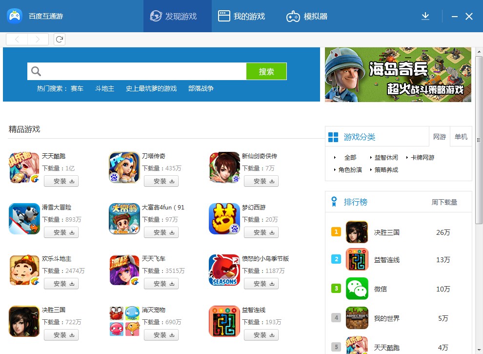 百度互通游是一款电脑玩安卓手游软件,专注于为各位玩家推荐手游、集合了市面上最新最热的安卓手游,同时聚集市面上最热门的手游模拟器,您要做的只是选好游戏直接玩!